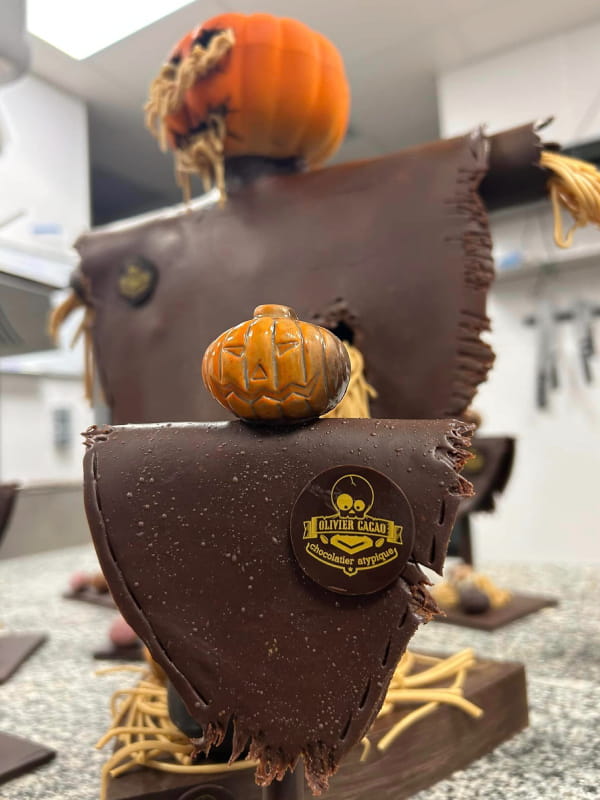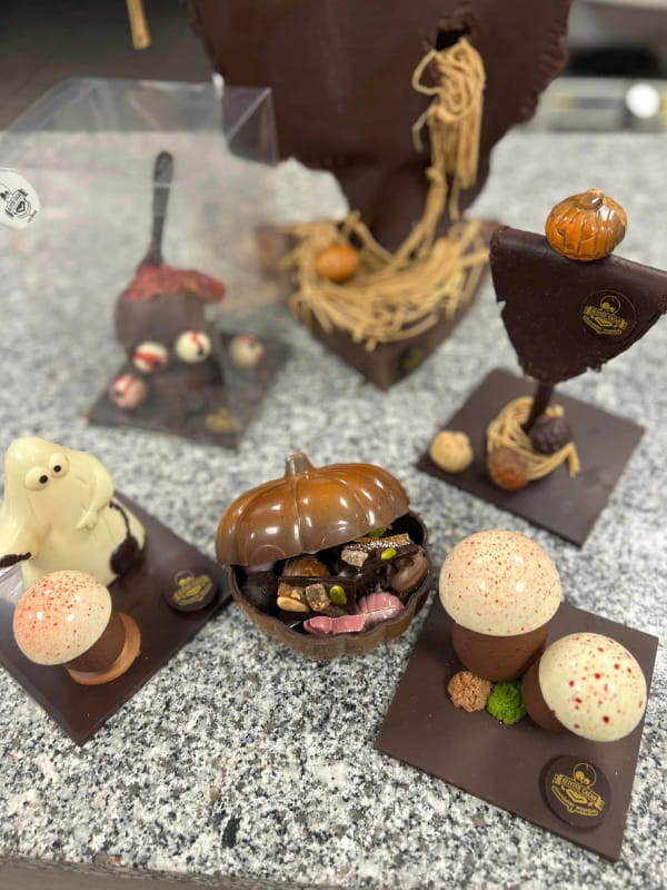 Période de l’année où la vitrine accueille : crânes fourrés, personnage de zombies tout aussi craquants et délicieux. Retrouvez également nos petits cercueils garnis de fritures de saison. Pour adoucir l’ambiance, les incontournables citrouilles multicolores vous souriront dans la boutique. Nous vous conseillons les yeux sanguinolents, fourrés pralinés… véritable tuerie cacaotée.